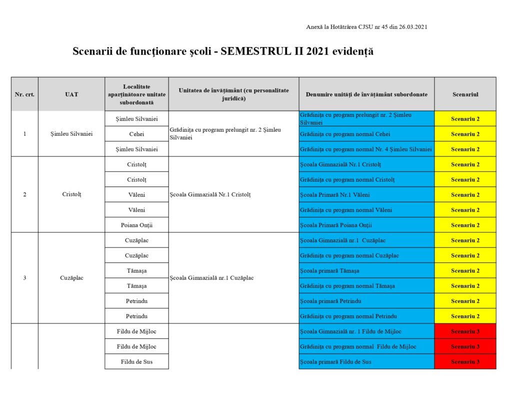 SCENARII DE FUNCȚIONARE A UNOR UNITĂȚI DE ÎNVĂȚĂMÂNT PREUNIVERSITAR DIN JUDEȚUL SĂLAJ ⇒Hotărârea C.J.S.U. nr. 42⇐